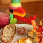 Drei Scheiben Sauerteigbrot, mit drei Aufstrichen dazu knuspriger Räuchertofu, karamellisierte Zwiebeln in Balsamico mit Grünzeug & Früchten. 19,50€